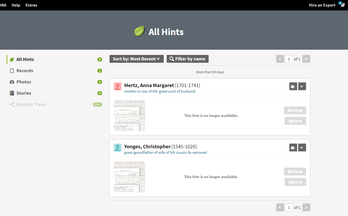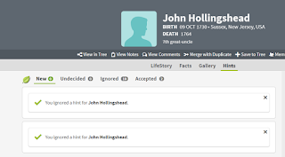 Fast forward several months and in speaking with an Ancestry rep at a national conference, I learned that Ancestry, periodically, would correct the situation by doing a refresh on their end. That did seem to work but for the past year and a half, even with their refresh, seven Ghost Hints remained. I finally discovered how to get rid of them and it’s very simple. Just follow these steps: