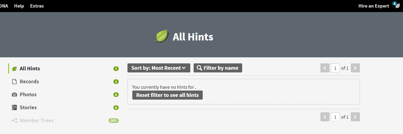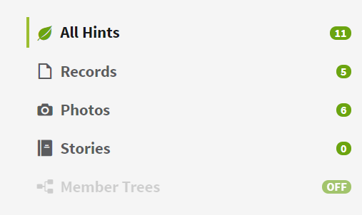 8. I successfully removed the Ghost Hints but notice that the counter on the left side and the leaf counter on the ribbon at the top are still wrong. Funny how the two counters don’t even agree on the total. The left side notes that I have one record and six photos for a total of seven All Hints. Math is correct although there is no record or photo hints appearing. The leaf icon claims I have 8 hints but when I click on the leaf, it states I have no hints – as shown in step 6 above. Perhaps when Ancestry does their updates the counter will correct itself. At least the counters have stopped showing I have negative hints as in the past, the counter sometimes displayed a negative number.