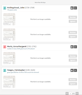 I finally discovered a simple way to remove Ancestry.com ghost hints. Ghost hints are those phantom records that once were available but for several reasons – maybe the original poster removed them or Ancestry no longer supports the source of the record – are now not available. Those hints show up under the “All hints” area but when you click on one to view, a pop up lets you know they are no longer available. They then remain a grayed out phantom forever; a reminder of what once was but as Poe so eloquently noted, “Quoth the raven, nevermore.”