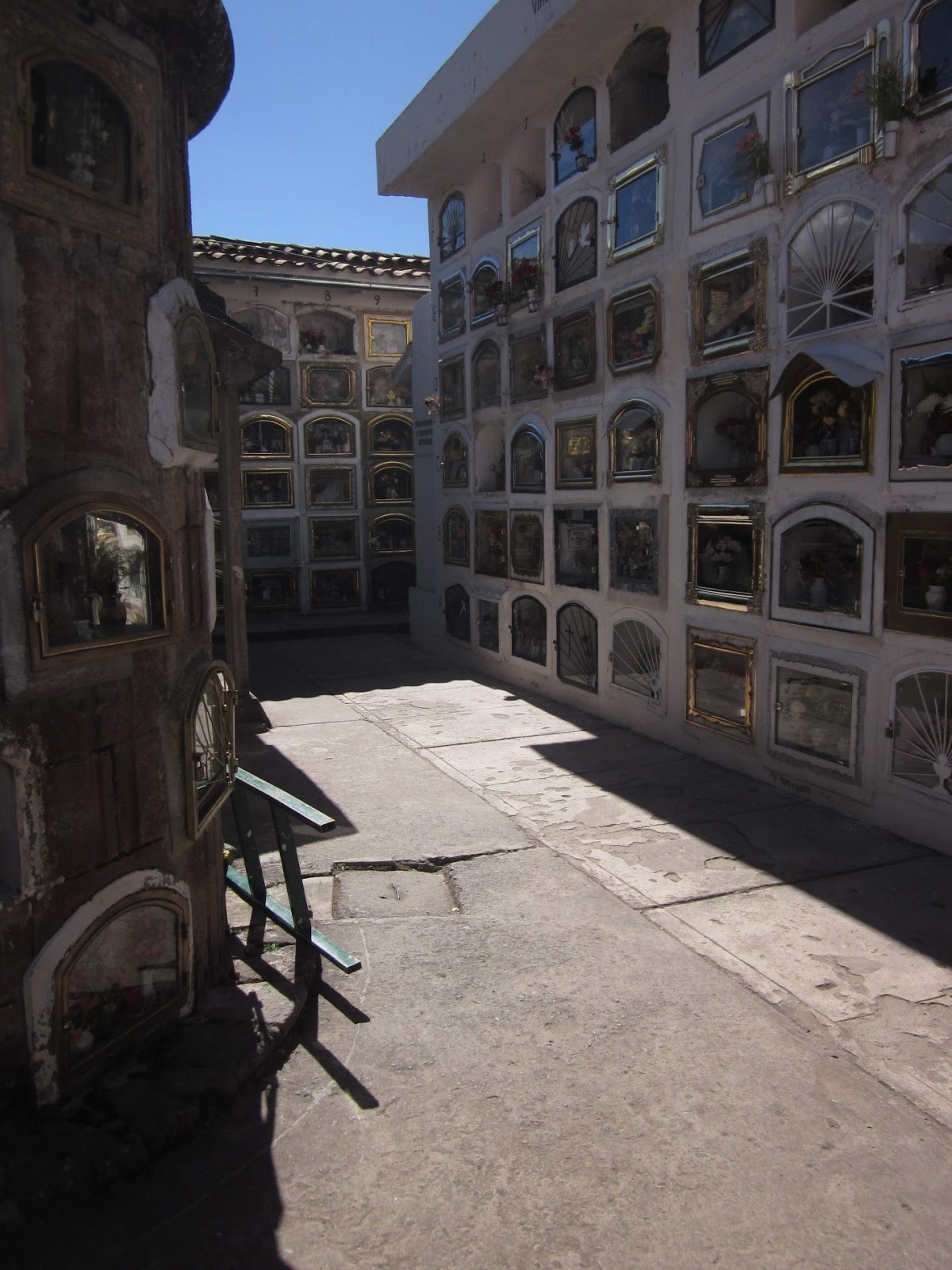 One of our stops was to visit a cemetery in Cuzco, pictured above. Families may “rent” a burial site and if the rent is not renewed or the space purchased, the body is cremated and interred in another portion of the cemetery. Families visit the cemetery often and remember the dead by displaying memorabilia from their life in a niche in front of the coffin that had been plastered into the assigned space. Items for purchase – such as flowers, vases, alcohol in tiny bottles, and career related articles – a small truck for a former truck driver, for example – may be purchased by vendors lined up outside the grounds.