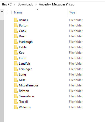 Clicking the zip file will display any folders you may have created to save correspondence. Mine looks like this:
