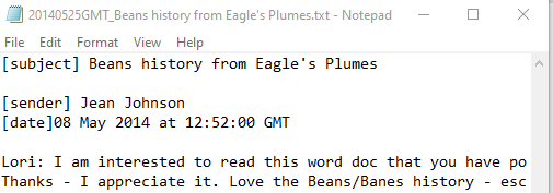 This simple task will take you less than 5 minutes. Why would you not want to save information from far flung family members? It’s also a good way to go back through old correspondence as a missed clue may be unveiled. Many of my messages contain email addresses and if I haven’t written to the individual in awhile, I might not be able to locate the address quickly if I need to in the future. Since you just never know where genealogy is going to take you, I’d rather be safe then sorry by saving the data today.